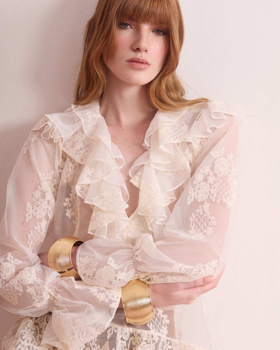 Bata em tule bordado. Possui modelagem com babados no decote e nas mangas e barrado.