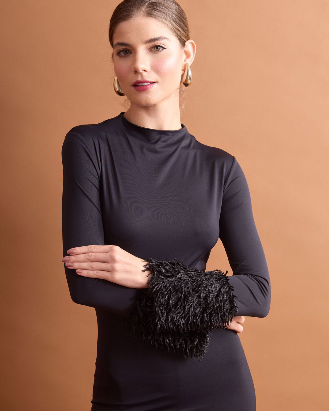 Blusa em malha power com modelagem manga longa. Possui punhos com aplicação de pelo, que trazem um toque sofisticado e marcante à peça, igual para produções modernas e elegantes.