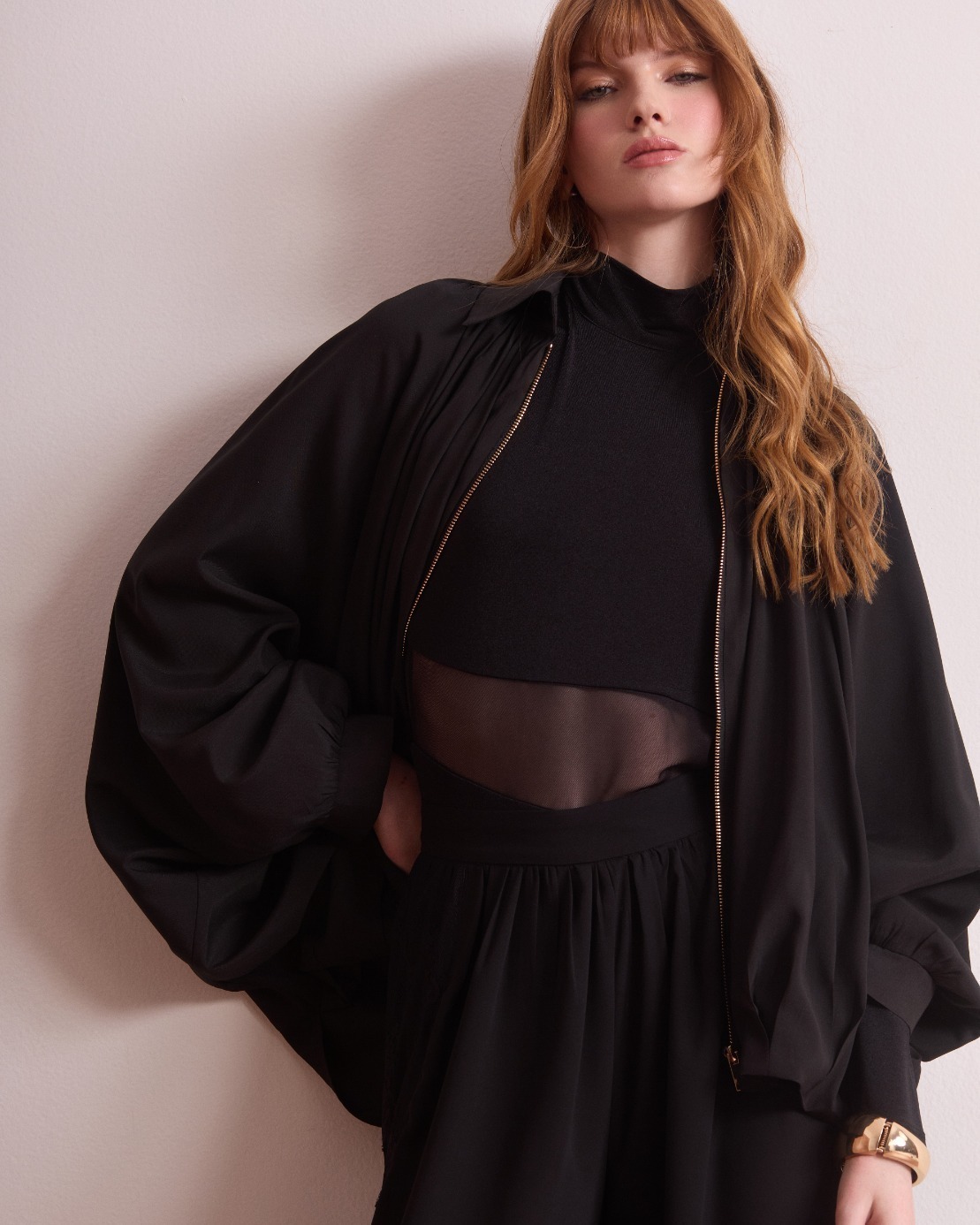 Body confeccionao em jersey com tule, que combina conforto com transparência sofisticada. O modelo possui gola alta e mangas longas, criando um visual elegante e contemporâneo. A transparência sutil do tule adiciona leveza e um toque moderno à peça.