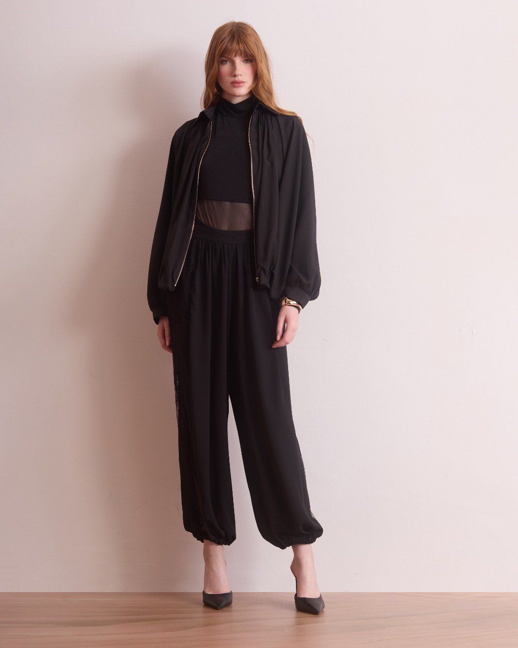 Calça shape baloon com apliques de renda nas laterais.