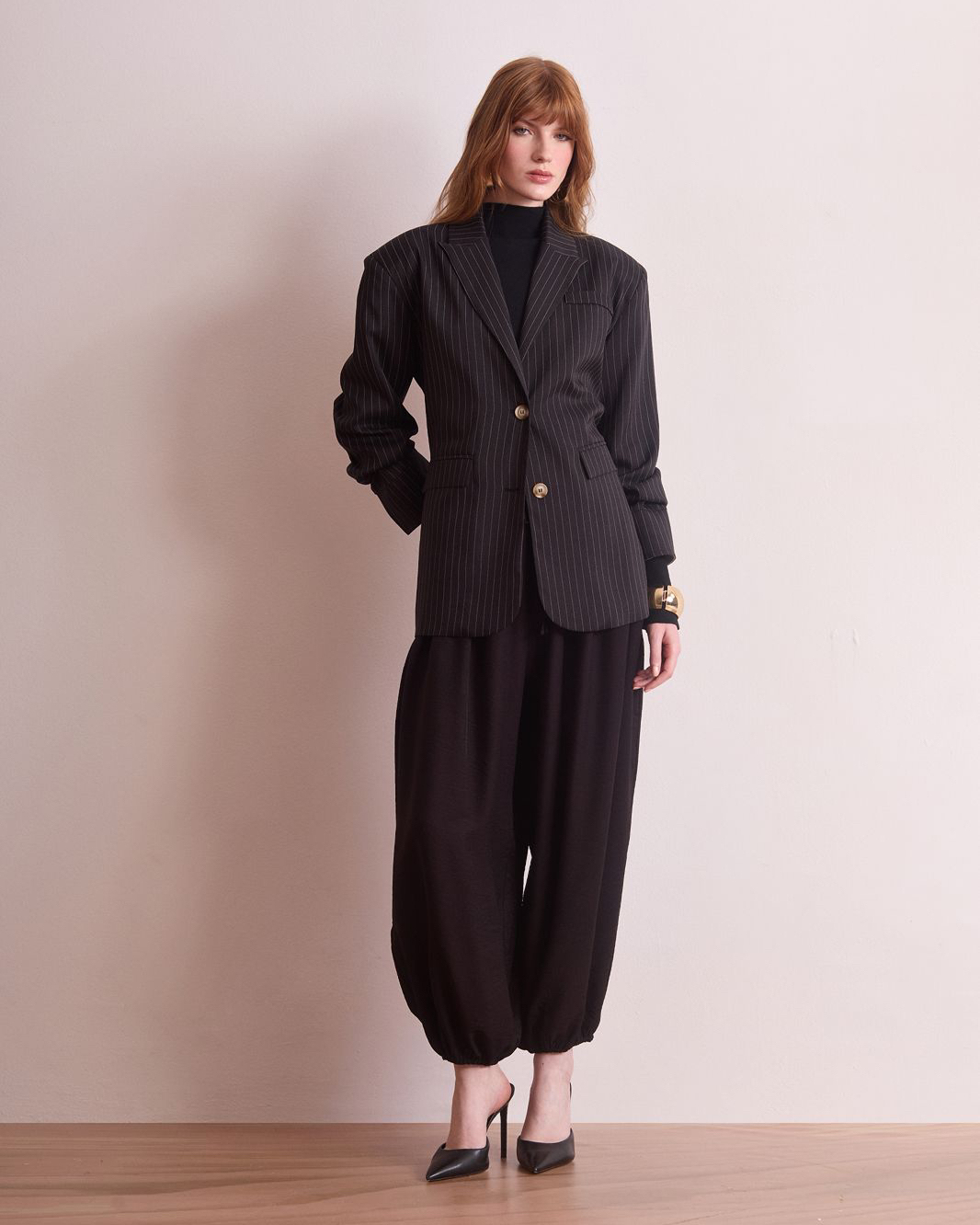 Tecido: Calça baloon em tecido crepe, levemente acetinado e encorpado. Possui cós elástico e ajuste para amarração.