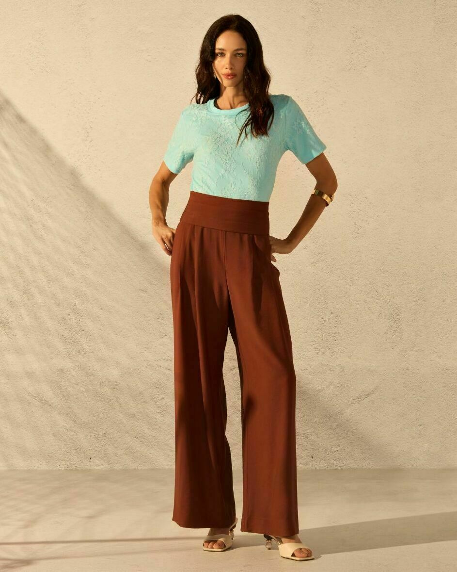 Calça em alfaiataria cupro com pala na cintura, clássico com modelagem impecável.