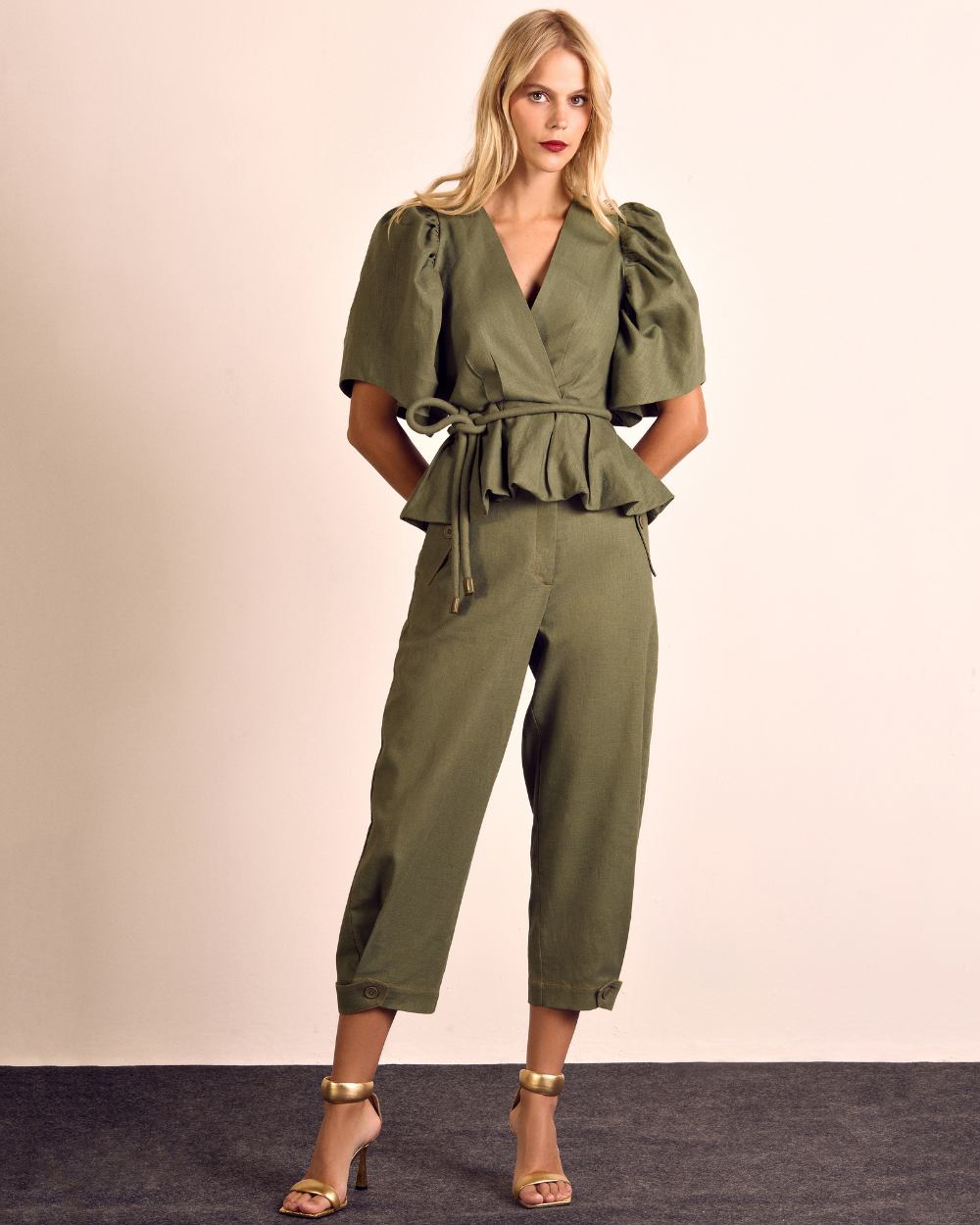 Calça em Rami com cintura médiae detalhes pespontados em linha ocre (tom terroso).