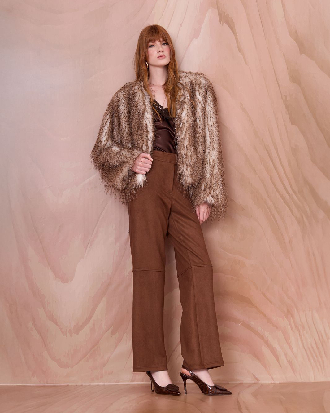 Calça flare em suede com cós deslocado e bolsos laterais.