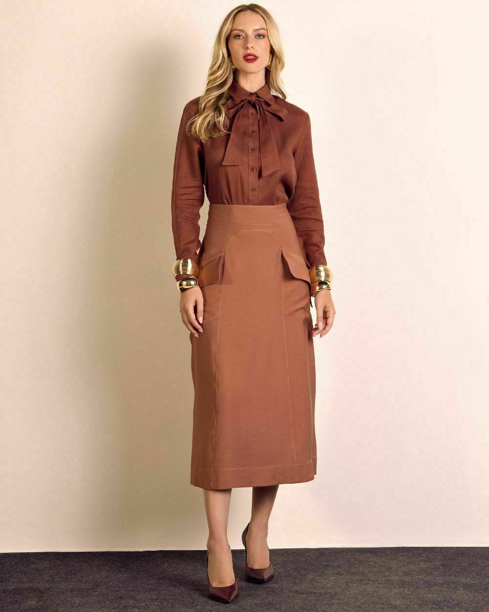 Camisa confeccionada em 100% linho com detalhe de laço. Modelagem com shape slim e punhos largos.