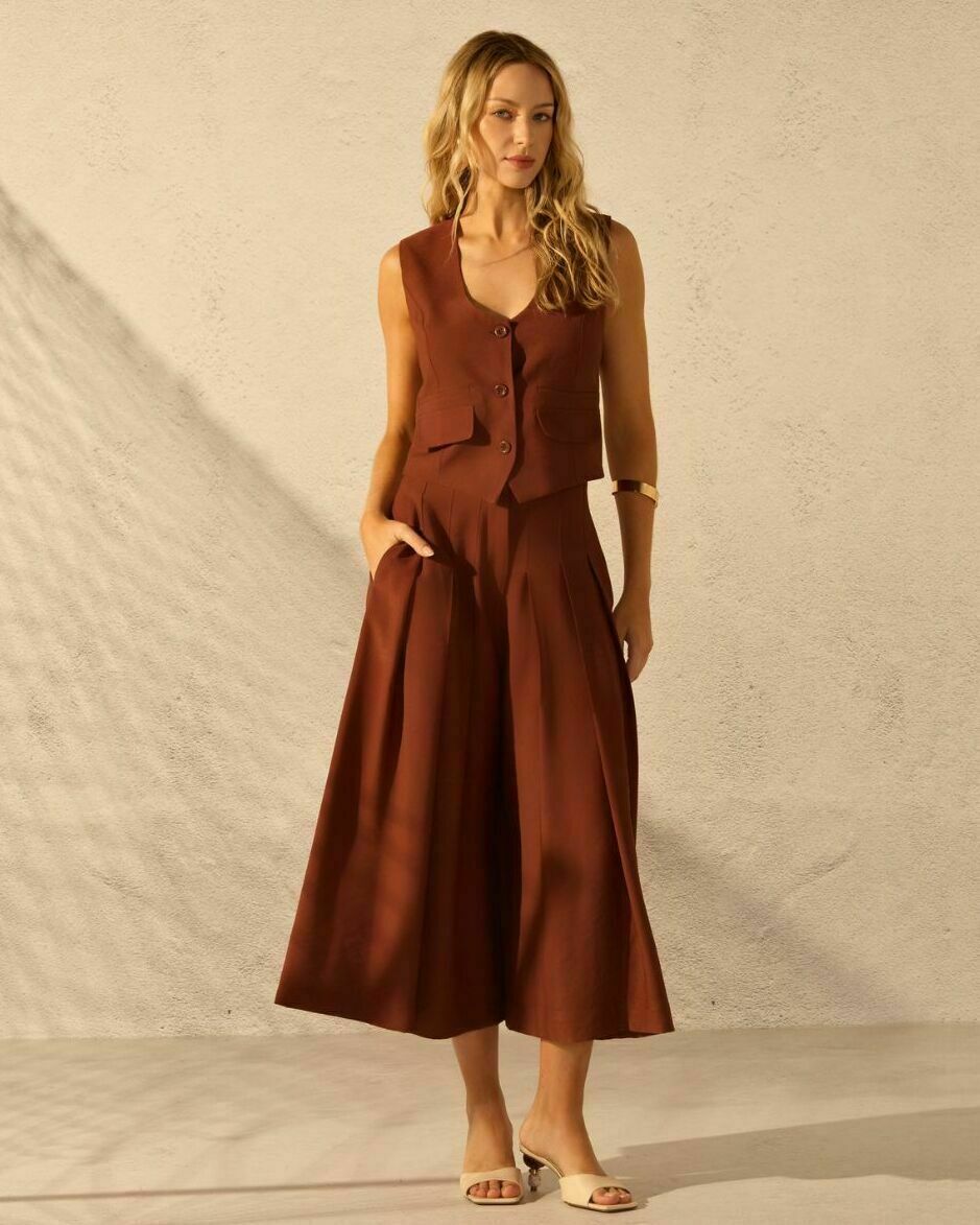 Colete em alfaiataria com modelagem estruturada e caimento impecável. Possui decote em "V", fechamento por botões frontais e bolsos aplicados, combinando elegância e versatilidade.