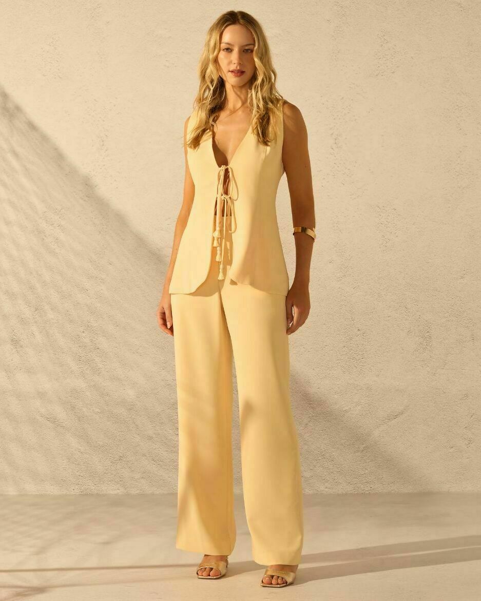 Conjunto em crepe de alfaiataria, composto por colete alongado com decote em V e amarração frontal, e calça de caimento rento que traz sofisticação à peça. Colete tem trabalho de pompons feitos à mão nas amarrações.