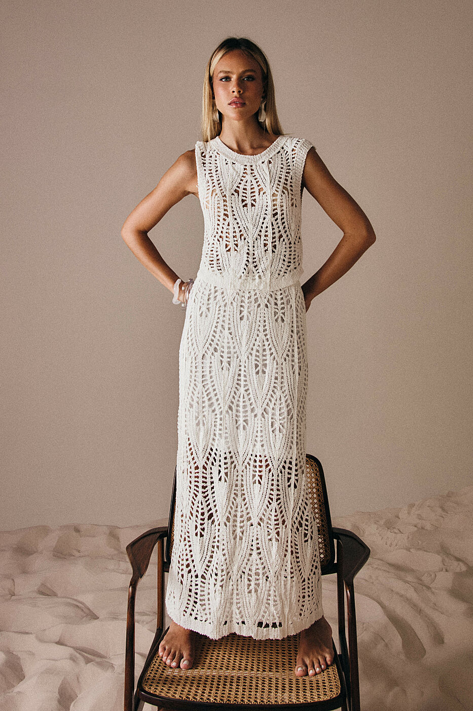 Conjunto Croche Saia Longa e Blusa sem Manga