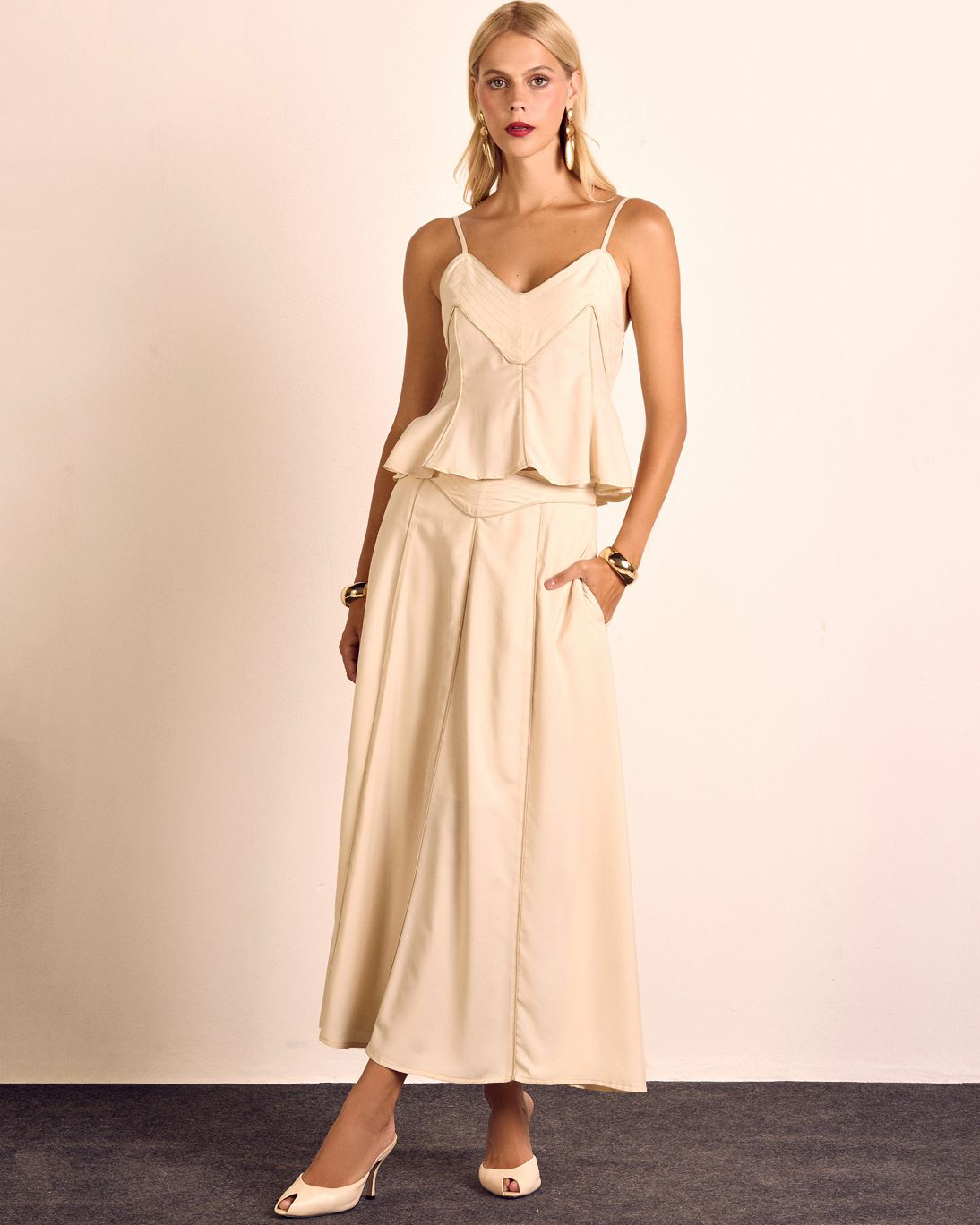 Conjunto elegante com recortes estratégicos e pespontos aparentes, que trazem um visual moderno e delicado. A blusa de alças finas possui decote suave e caimento fluído, enquanto a saia longa apresenta modelagem levemente evasê.