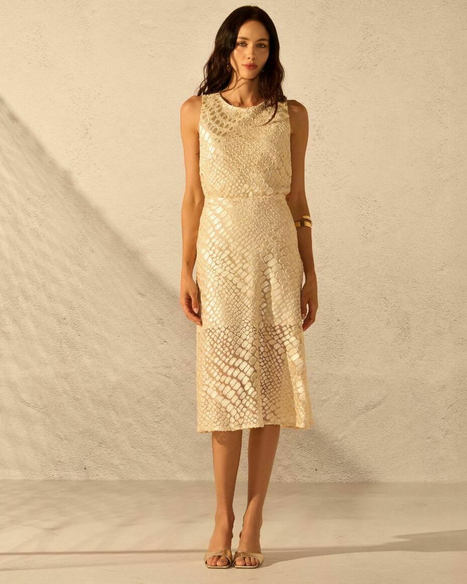 Conjunto em tule texturizado, composto por blusa nadador e saia midi evasê. As peças possuem forro interno e acabamento delicado, unindo leveza, conforto e sofisticação em um visual feminino e elegante.