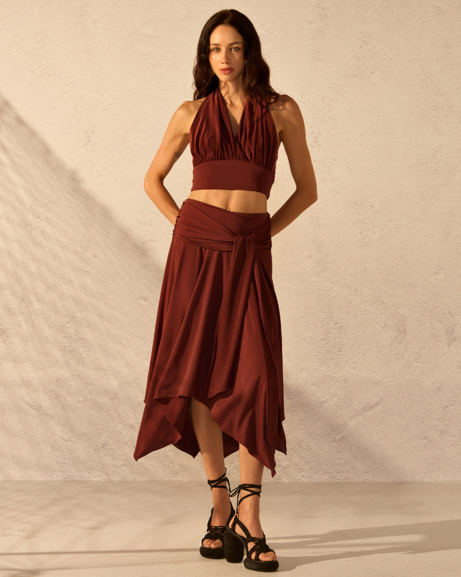 Saia midi confeccionada em jersey com toque suave e caimento fluído. O modelo apresenta corte assimétrico com pontas nas laterais e faixa para amarração na cintura, permitindo ajuste e valorizando a silhueta.