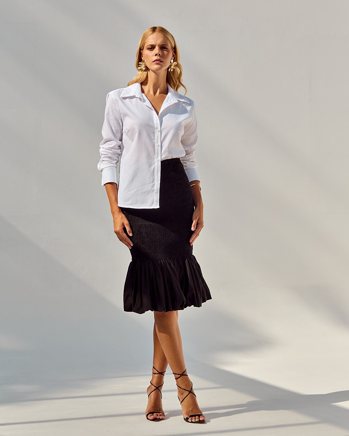 Saia midi em tricoline com corpo todo em lastex. Possui detalhe em balonê na barra.