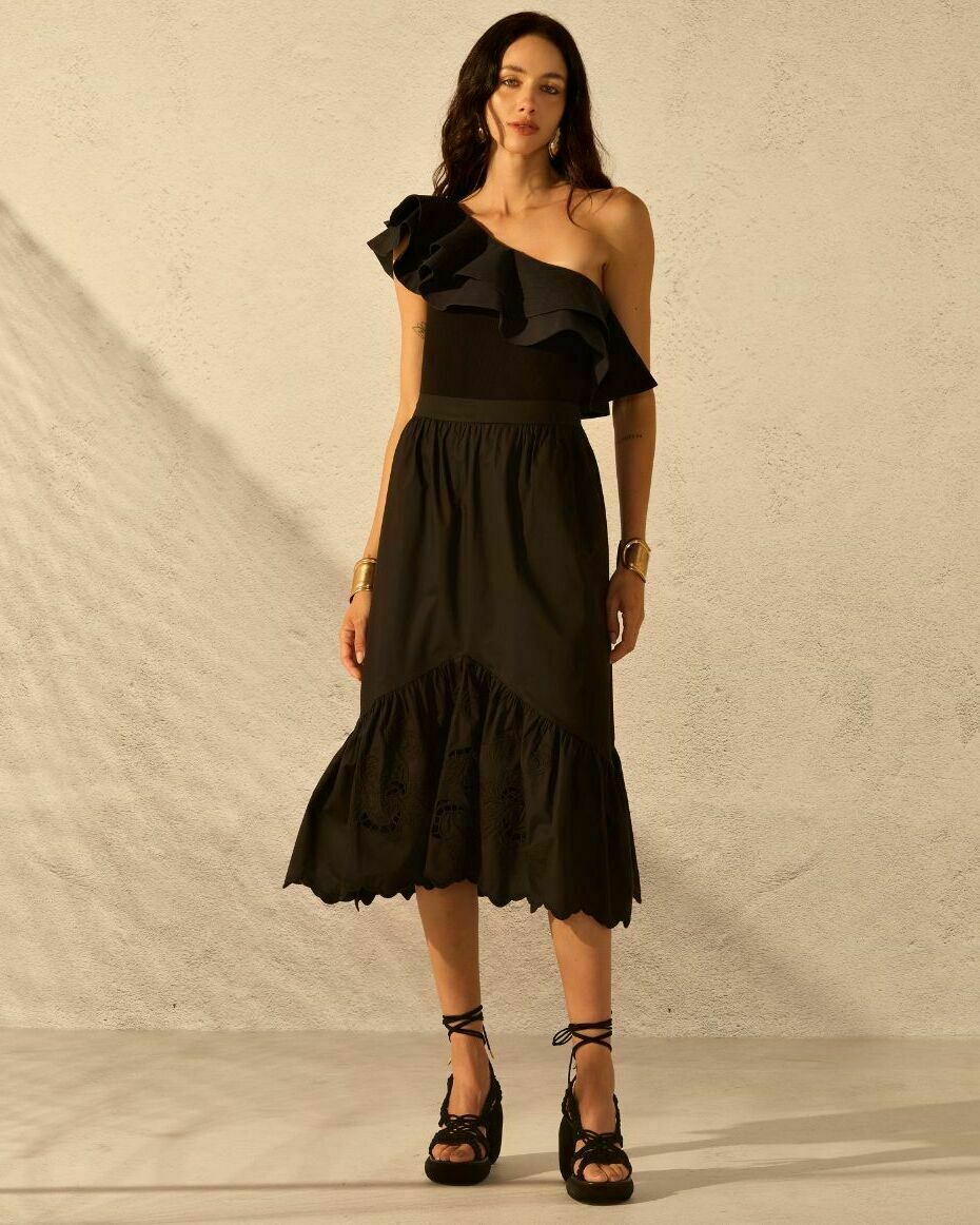 tecido: saia midi confeccionada em trticoline paper touch. Possui modelagem ampla com detalhe franzido no barrado, e bordado richelieu exclusivo no babado.