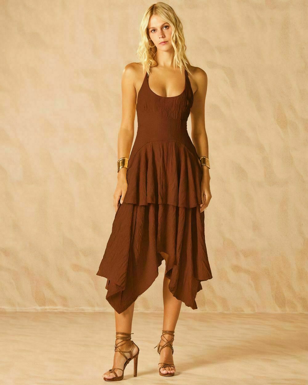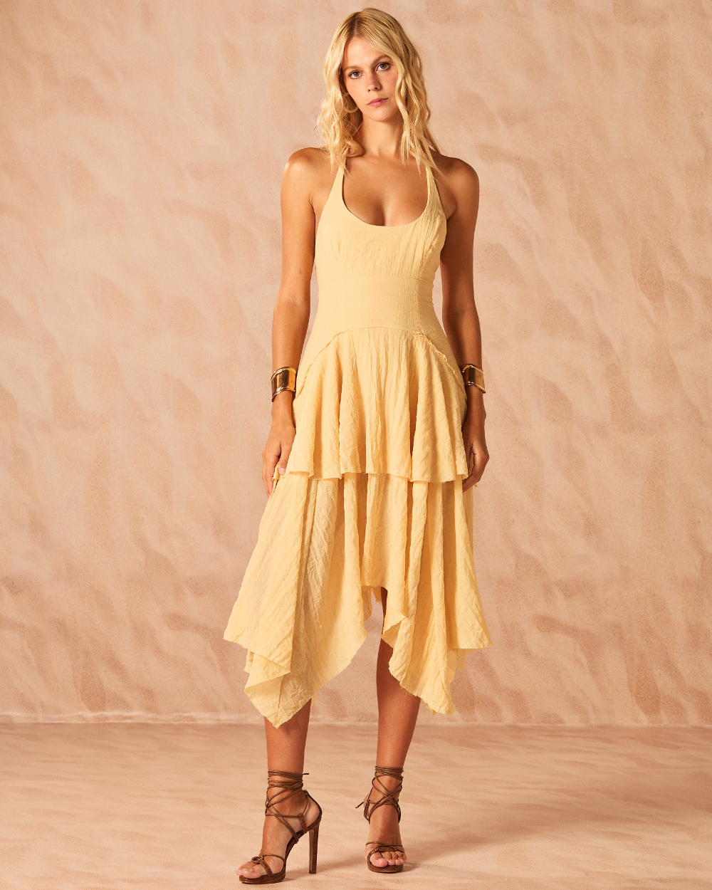 Vestido midi em tecido com textura "amassadinha. Modelagem fluída e barra irregular em pontas que garante movimento e modernidade ao look. Possui detalhe nas costas de aplicação de ponteiras resinadas, que dão um charme a mais ao look.
