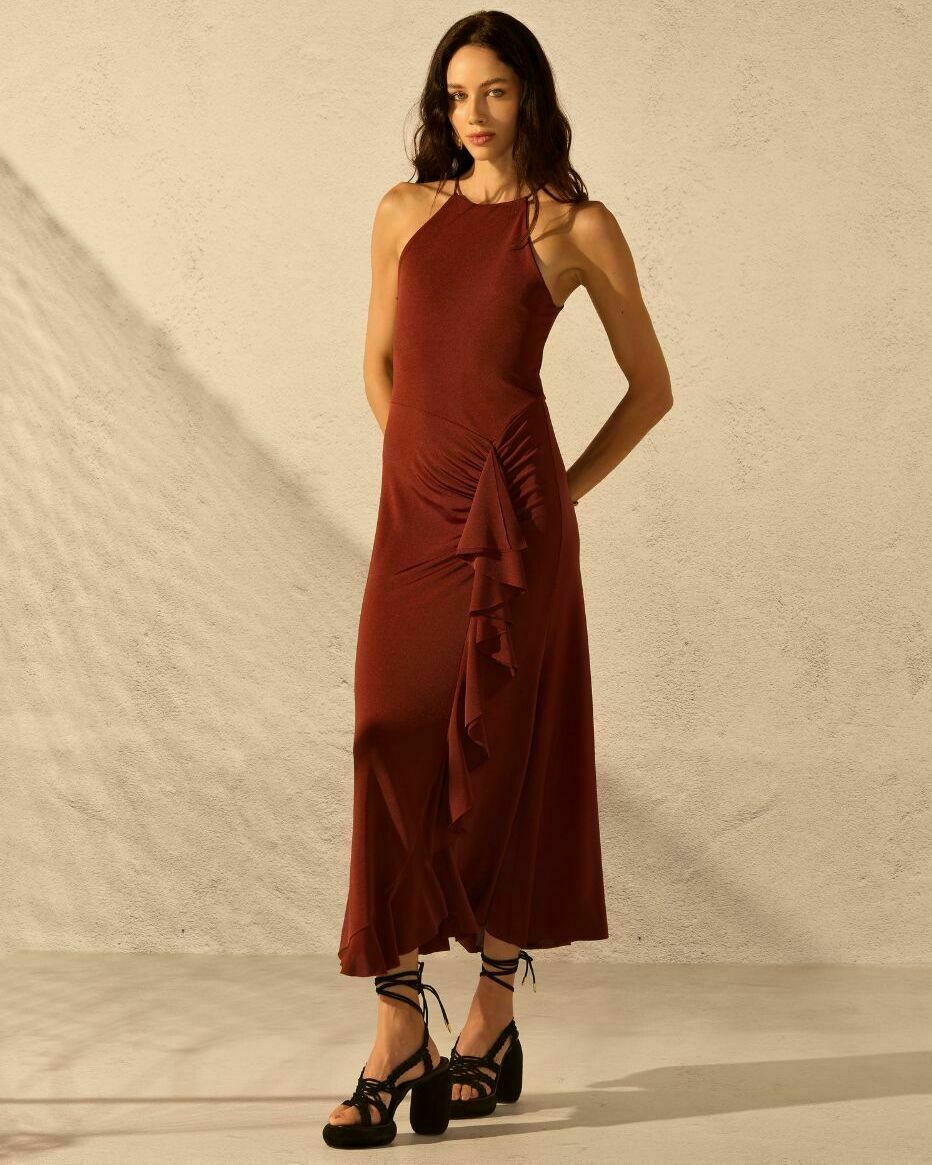 Vestido midi confeccionado em malha Jersey com toque macio e caimento fluído. Possui modelagem ajustada ao corpo, decote haltere detalhe drapeado com babados frontais, que adicionam movimento e sofisticação ao visual.