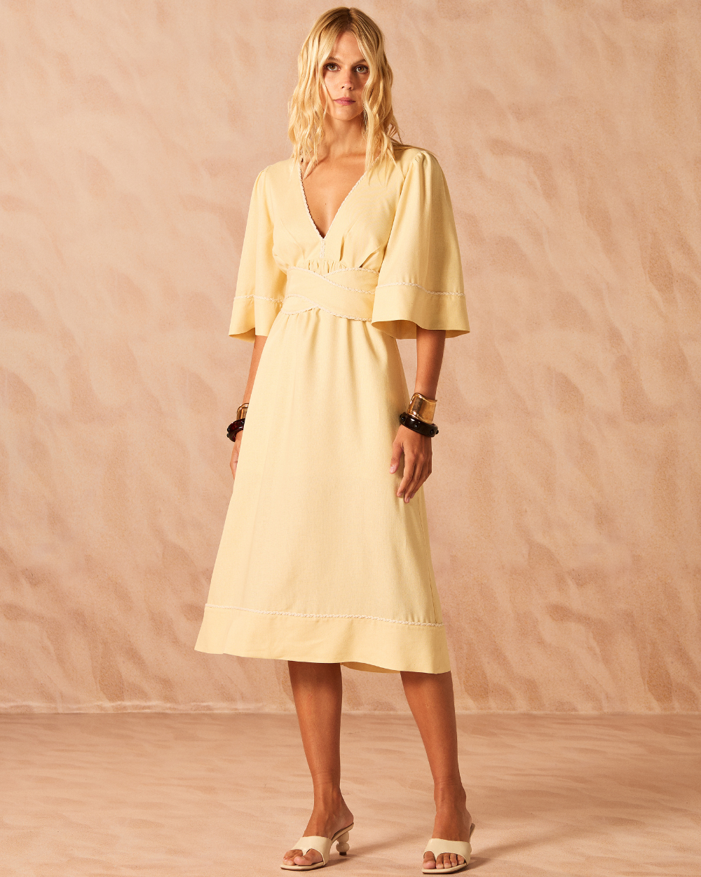 Tecido: vestido midi confeccionado em linho, com decote em V e mangas amplas que proporcionam leveza e elegância. Acompanha cinto no mesmo tecido, com finalização em rendas, realçando a cintura e valorizando a silhueta.