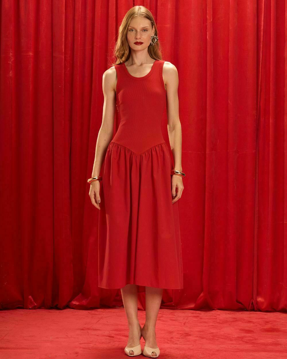 Vestido regata com parte superior em malha canelada que se ajusta perfeitamente ao corpo, proporcionando conforto e leveza. A saia é confeccionada em tricoline, com shape de cintura baixa e leve franzido.