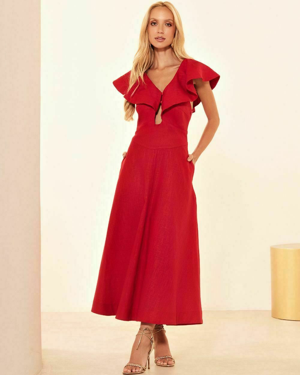 Vestido midi em crepe, com modelagem que valoriza a silhueta e traz movimento leve. Possui mangas com babado, decote em "V"com recorte frontal e caimento fluído.