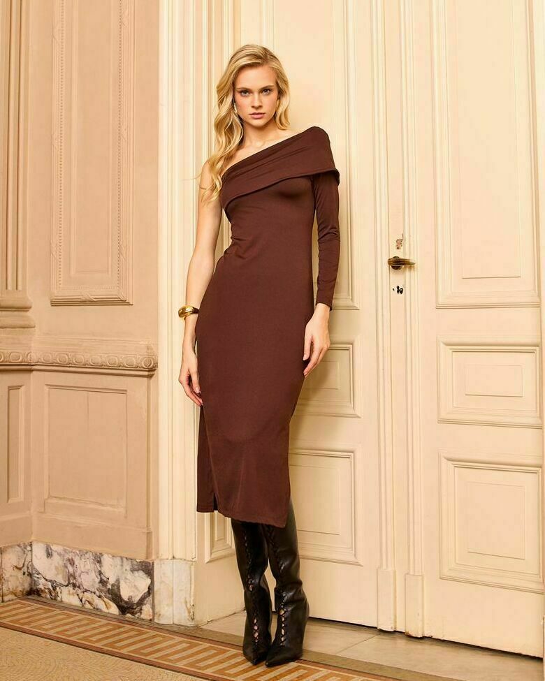 Vestido midi em malha canelada, com modelagem ajustada que valoriza a silhueta com conforto.