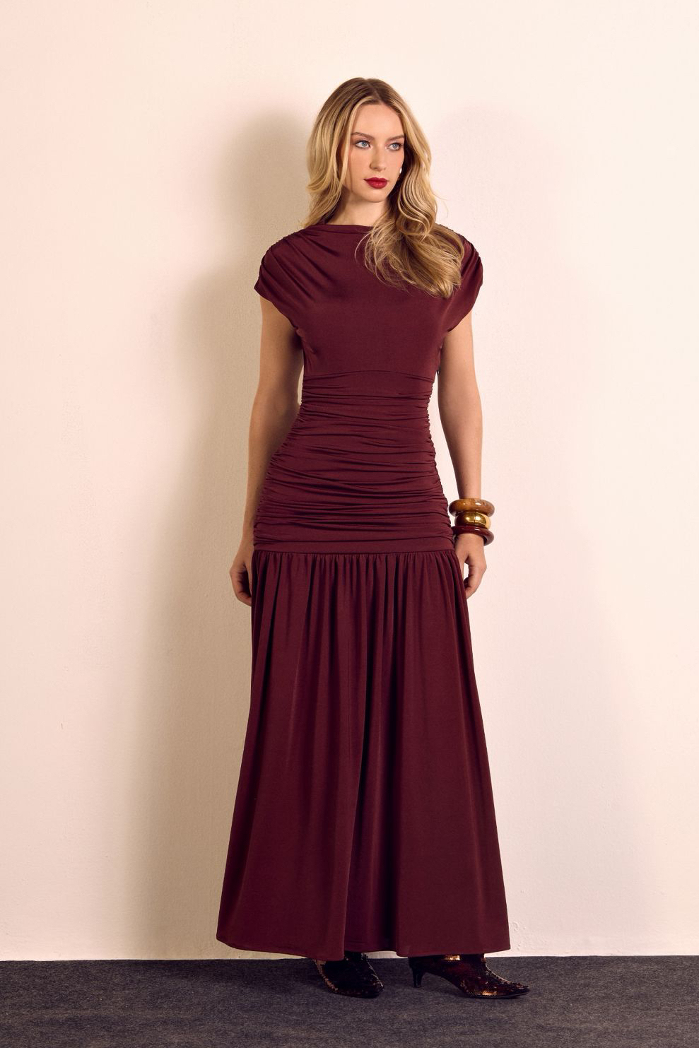 Vestido confeccionado em malha jersey. Modelagem com busto estilo "camiseta"e detalhe de drapeado na cintura, que cria um efeito elegante e favorece o corpo. A saia é ampla com franzidos, e traz uma proposta perfeita para peça.