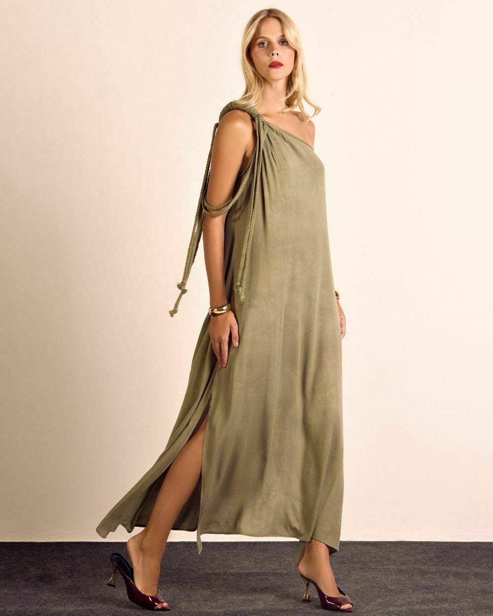 Vestido longo ombro únicoem viscolinho.